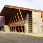 The detailing and modulation of the exterior walls and shed roofs reference the Salish Plank Houses and serve to break up the mass of the building. The large entry canopy supported by canted wood columns and beams provides a warm counterpoint to the industrial character of the building finishes.