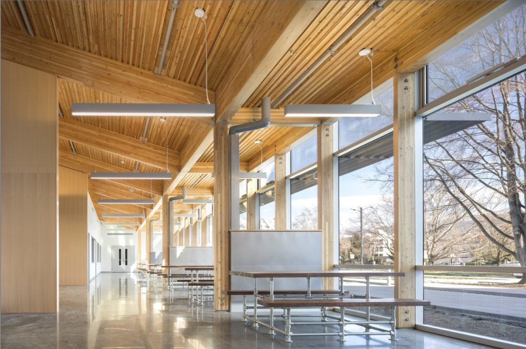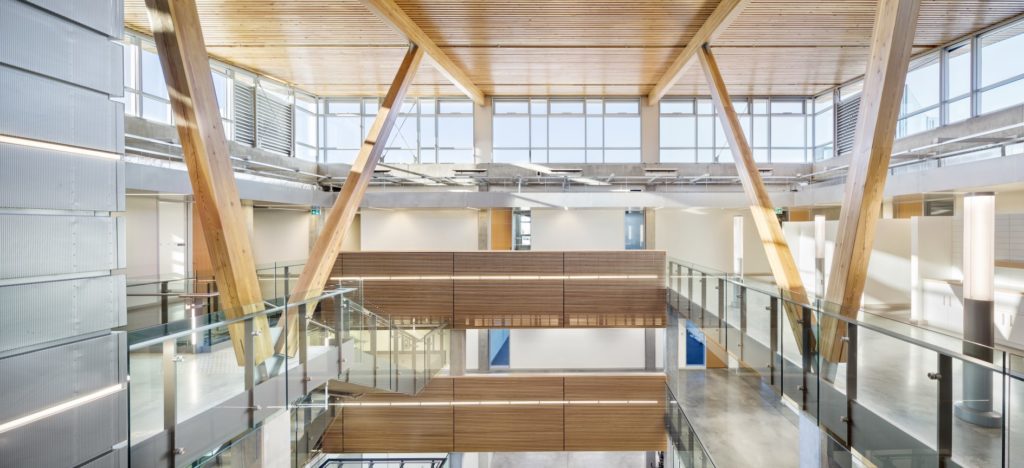 The building accommodates classrooms, group offices, labs, trades shops, a café and student social-study space for the broader campus.