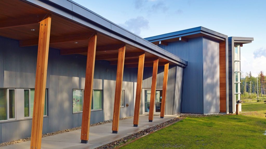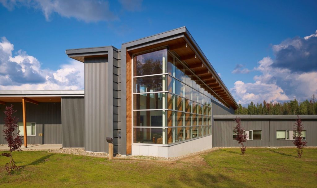 The Prophet River Multiplex is located 90km south of Fort Nelson in the First Nation Reserve of Prophet River. The multiplex houses three distinct wings: a health centre, administrative offices including a council chamber, and a small gymnasium with a weight room. The three wings are joined at the center by a unique vaulted atrium space.