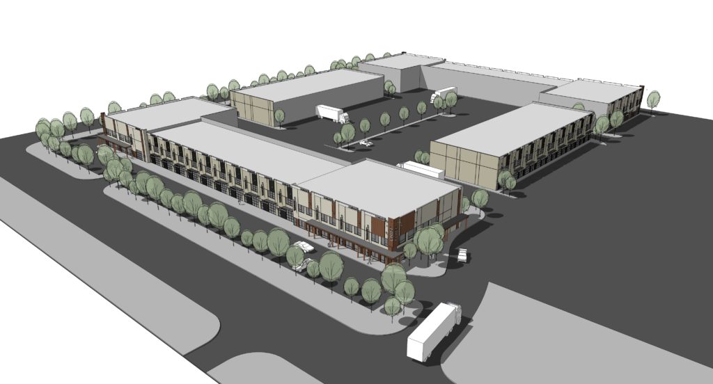 Wood canopies and cladding accents provide warmth and reference the development west coast architectural expression. Units are flexible for a multitude of retail and light industrial uses with welcoming storefront scale to the front and truck access in the rear.